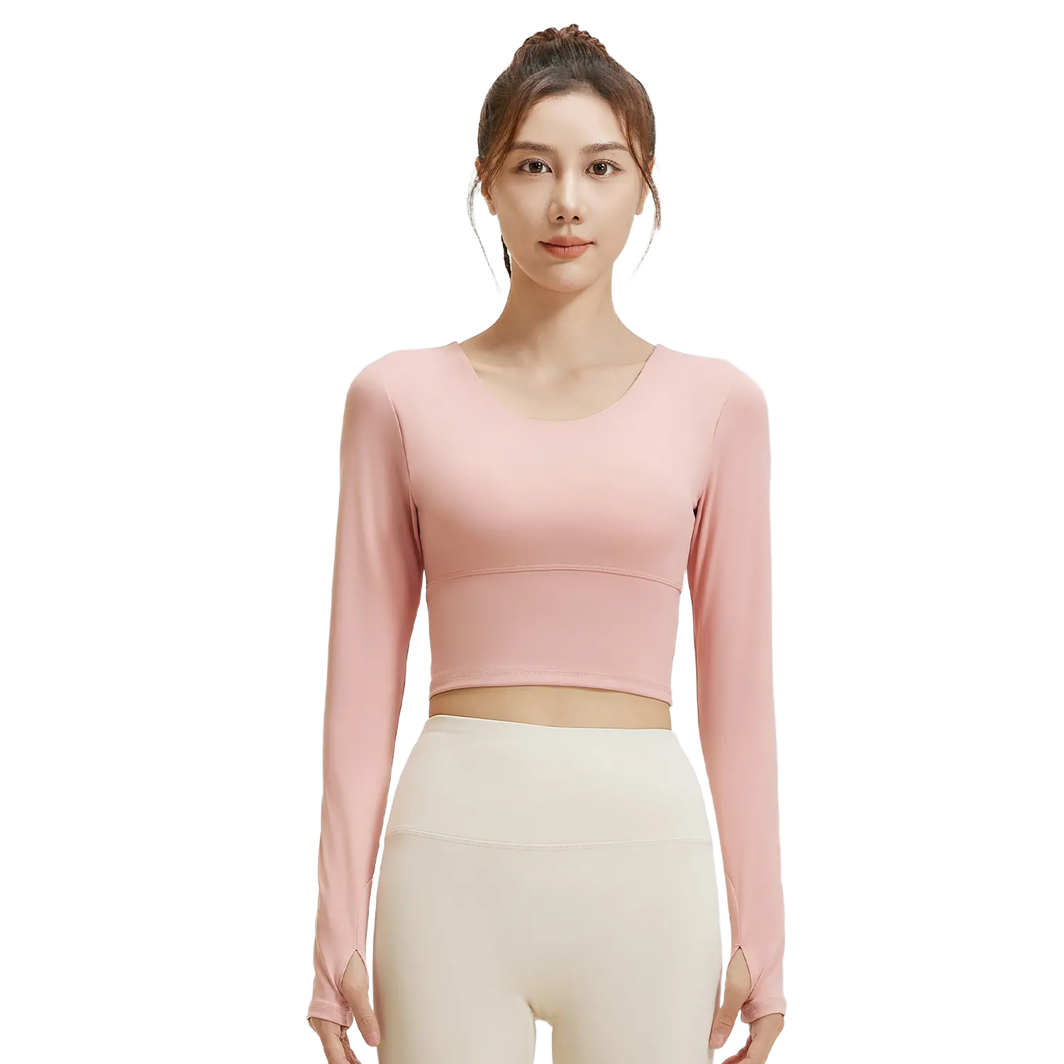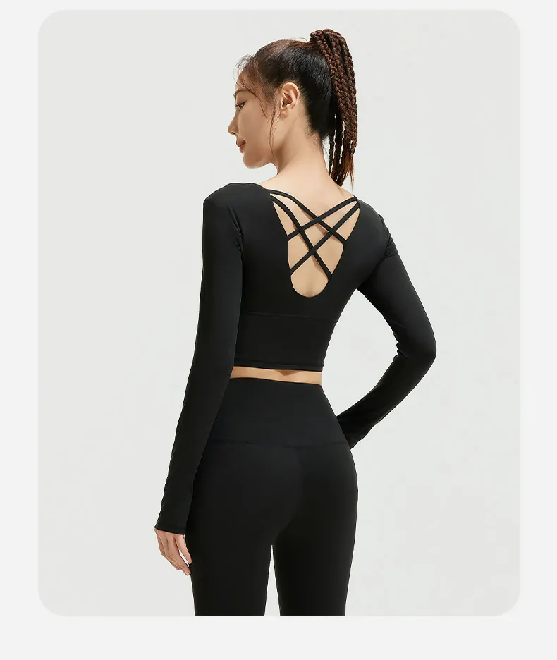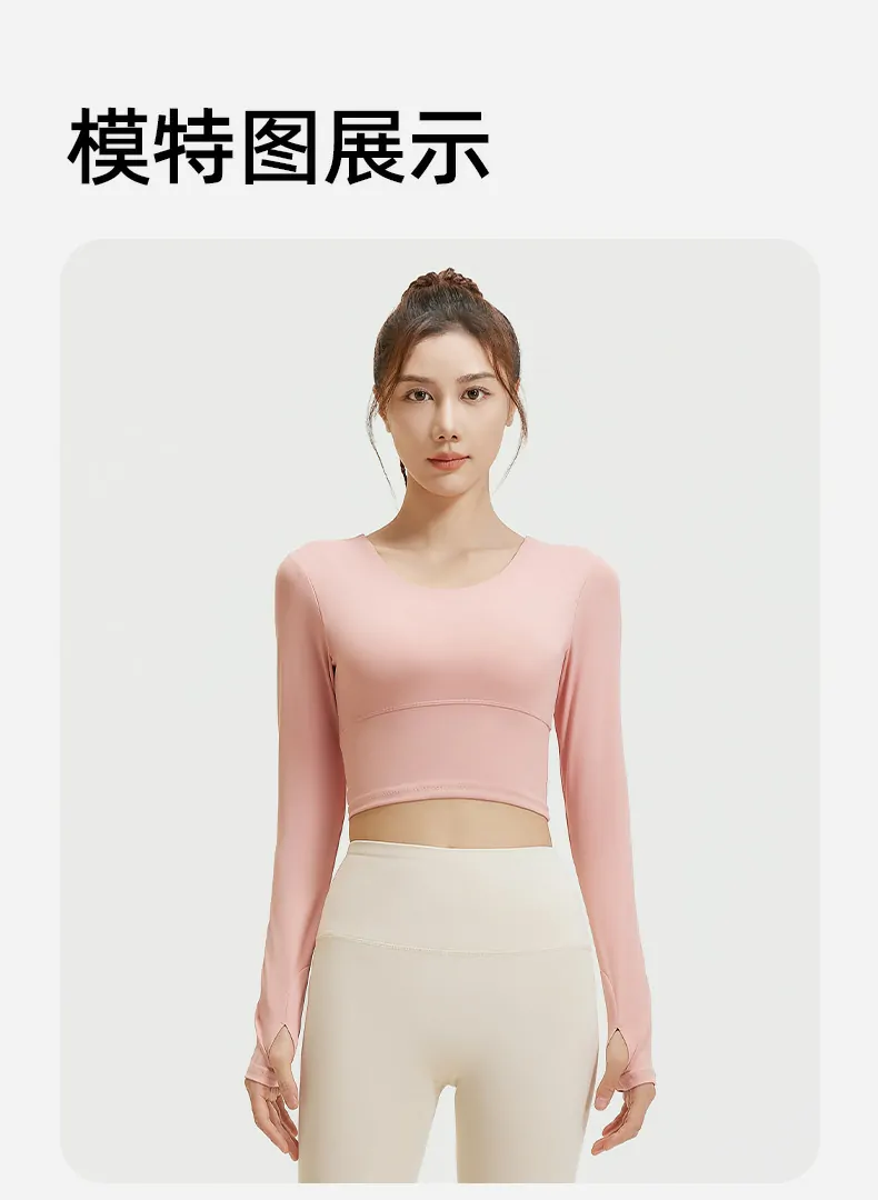 Wholesale women’s long sleeve cropped fitness tops made with 82.5% polyester/17.5% spandex fabric. Four-way stretch, quick-dry, and breathable. Ready stock, low MOQ, OEM/ODM supported. Ideal for Amazon, eBay & global retailers. Request samples & bulk pricing.