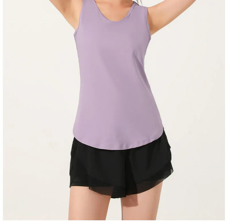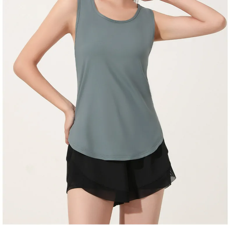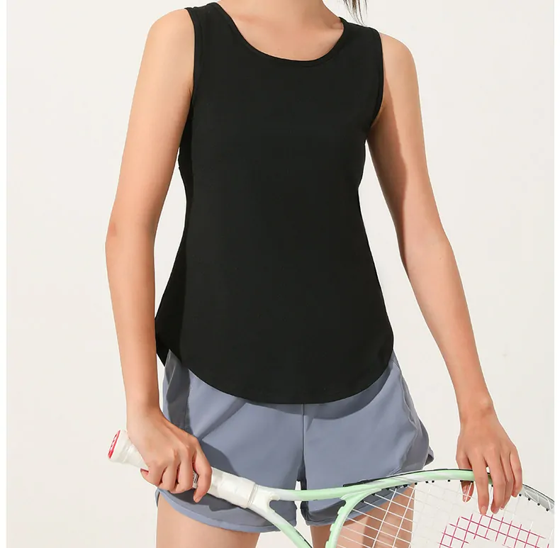 Wholesale women’s sleeveless active vest. 88% polyester/12% spandex for breathability & stretch. Loose fit, hip-length, ideal for spring/summer. OEM/ODM, ready stock. Request free samples & bulk pricing.