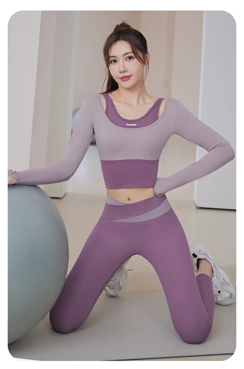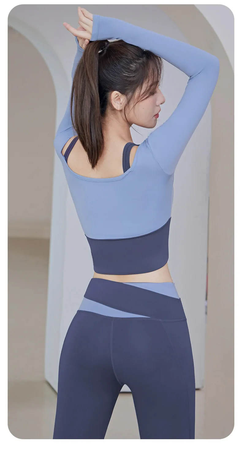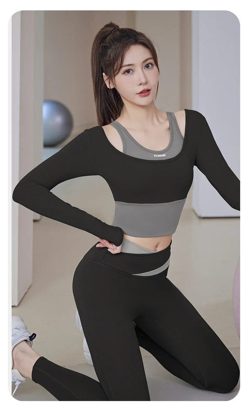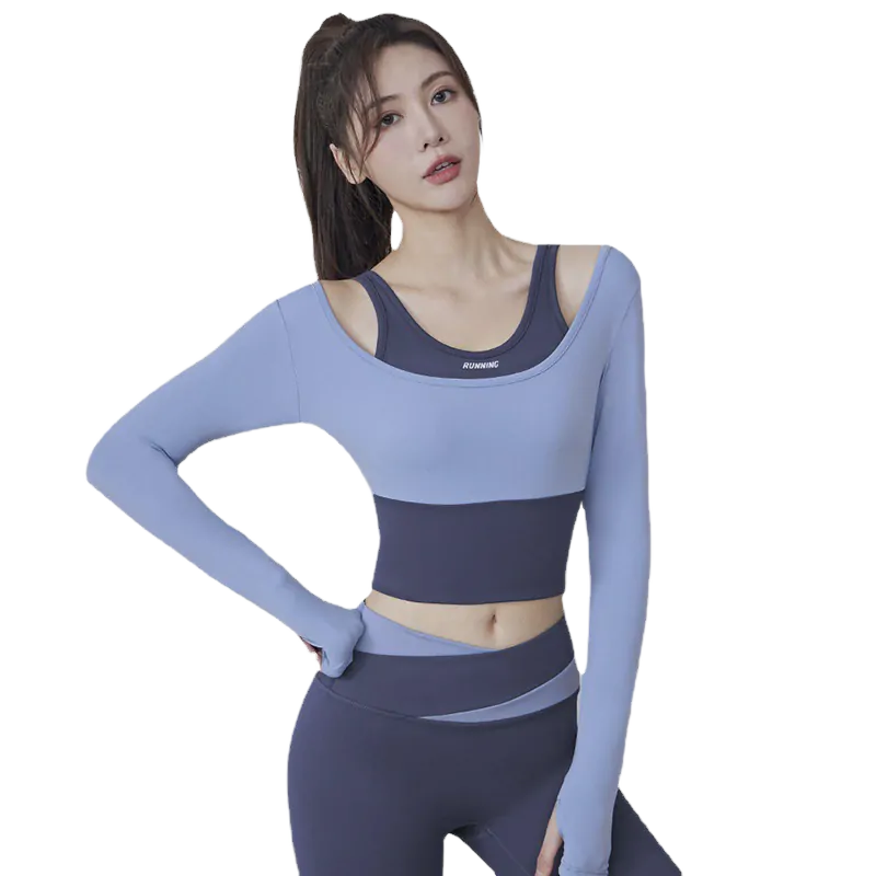 Women’s Long Sleeve Fitness Top – 2-in-1 Layered Design with Built-in Bra for Gym